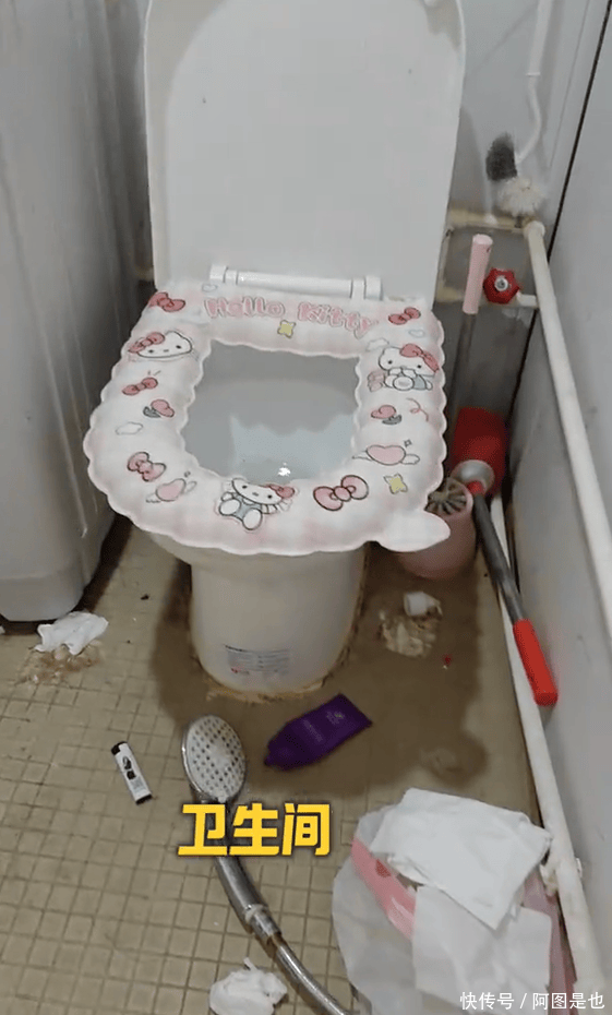 紧接着男子走进了卫生间,马桶上套着一个卡通印花的马桶套,地上扔满了垃圾和纸巾,所有的物品都凌乱不堪,完全没有一丝整洁利落的现象。