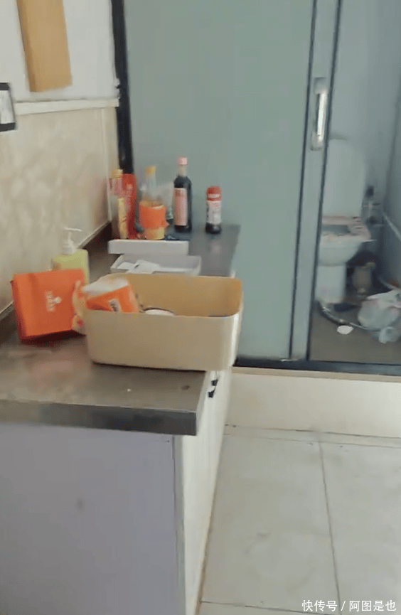 视频开头是男子进入房间的画面,映入眼帘的先是一套厨柜,厨柜上并没有多少做饭的工具,而是摆满了杂物,只有柜子里面有一个电饭煲。